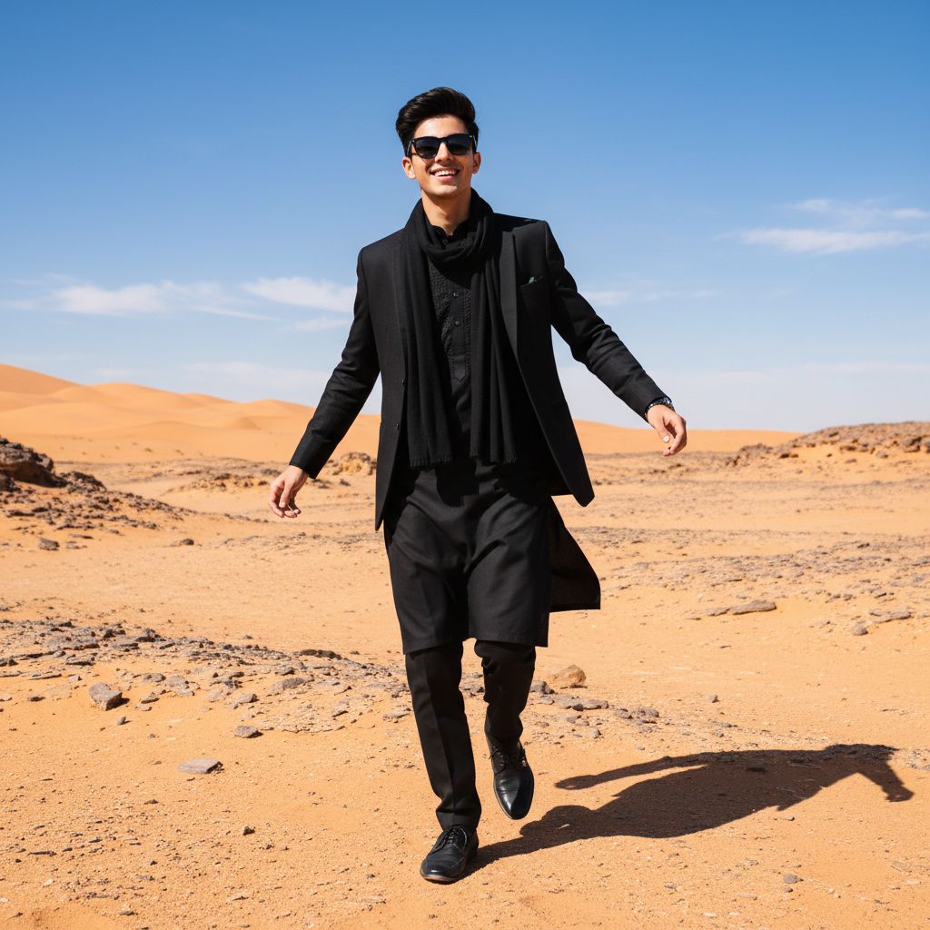Full-body portrait of an 18-year-old young, handsome man with a skinny body, lightly dancing in the center, walking forward in a bright daytime desert setting (Rath ki midan). He wears a pure black traditional kurta, a waist-length formal black coat (not long), and a thick, plain black muffler resting naturally around his neck with no wrapping or twisting. Replace the face with MY FACE, ensuring 100% accuracy in lighting, shadows, angle, and realistic skin details. Add stylish black sunglasses to complete the look. On both sides, very close to him, a lively Balochi group dressed in traditional white clothing with unique Balochi pagdhi (head turbans) joyfully dances along with the main subject, matching his light dance steps, creating a culturally vibrant and energetic scene. In the far background (dür), two Afghan men stand as bodyguards, each holding an AK-47 in a controlled, non-aggressive stance. They should appear protective but should not overpower the scene, maintaining a safe distance while adding a sense of security.