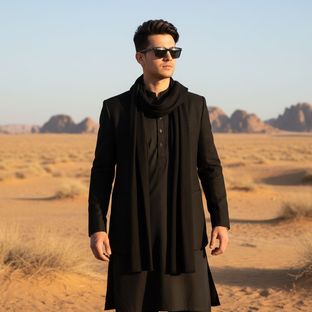 Full-body portrait of an 18-year-old handsome man with a skinny body, standing confidently in a bright daytime desert setting (Rath ki midan), striking a natural, youthful, and slightly dynamic pose as if enjoying the cultural atmosphere. He wears a pure black traditional kurta, a waist-length formal black coat (not long), and a thick plain black muffler resting naturally around his neck with no wrapping, twisting, or looping, just hanging loosely on both sides. Replace the face with MY FACE, ensuring 100% accuracy in lighting, angle, shadows, and realistic skin details. Add stylish black sunglasses. On both sides, Balochi men in traditional attire are energetically dancing in a cultural group performance. The young man enjoys the moment, showing subtle movement, participating in the vibe. Keep the background dancers visible and lively but slightly blurred for depth to maintain focus on the main subject.