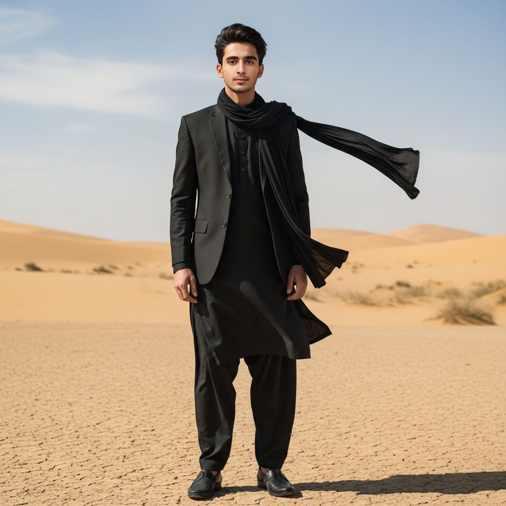 Full-body portrait of an 18-year-old handsome man with a skinny body, standing in a bright daytime desert setting (Rath ki midan). He is wearing a pure black traditional kurta, a waist-length formal black coat, and a long plain black muffler draped naturally around his neck. Replace the face with MY REAL FACE, ensuring 100% accuracy in lighting, angle, shadows, and expression. New Pose: The young man stands with feet slightly apart, upper body leaning slightly forward as he performs a playful spin. One hand is stretched outward with the palm open, while the other hand is curved near the chest, part of an expressive dance move. The pose radiates youthful charm, lively cultural energy, and natural flow, complemented by a soft, confident smile and stylish black sunglasses. On both sides, Balochi men in traditional attire are dancing with expressive arm movements and joyful energy. Keep them visible and active but slightly blurred to create depth, ensuring the main subject remains the focus. Maintain ultra-realistic lighting with natural shadows and soft highlights, reflecting the warm desert setting.