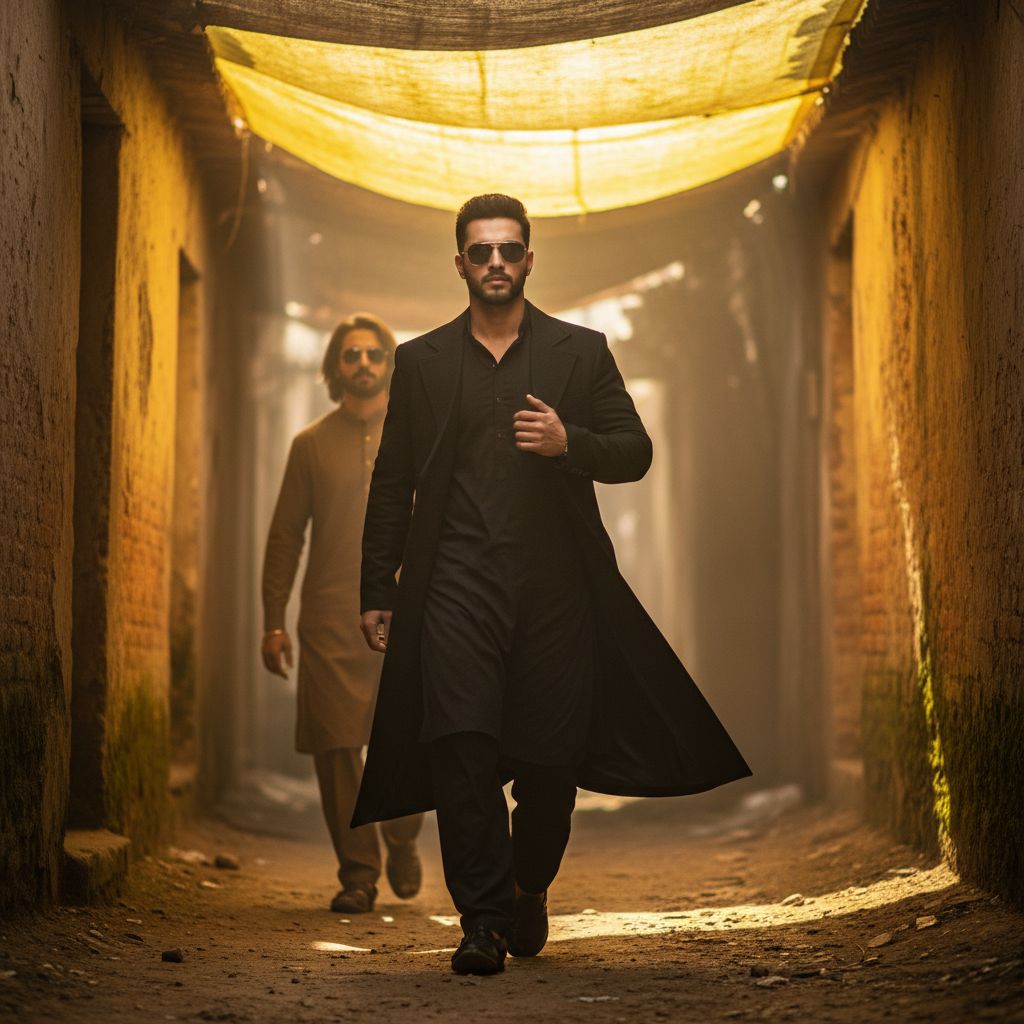 Cinematic realistic shot of a stylish young man walking confidently through a narrow rustic alleyway with earthen walls. He is wearing a black kurta pajama paired with a long black coat and black aviator sunglasses. He has a groomed beard and short dark hair. He is gesturing with one hand raised near his chest while walking. Behind him, out of focus, is another man with long hair wearing a brown kurta and sunglasses. Overhead, a yellow tarp filters warm golden sunlight creating a dramatic atmosphere. High definition, 8k resolution. Don't change the face, make sure the face is the same.