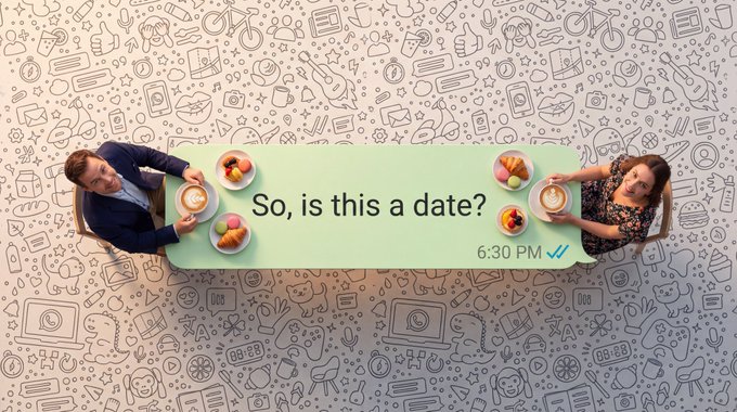 Hyper-realistic top-down macro photography. A long, light green WhatsApp speech bubble acting as a dining table. Two real living humans (shrunk to tiny scale) are sitting at opposite ends. They are NOT plastic figures; they have visible skin texture, natural hair, and realistic clothing folds. They are eating real food that looks freshly cooked, not play-doh. The text inside reads: "INSERT TEXT". Bottom right has a timestamp '3:33 PM' and blue ticks. The background is completely filled with a high-density, seamless WhatsApp doodle pattern (line art icons) covering the entire surface edge-to-edge with no empty spaces, resembling the original dense WhatsApp wallpaper. Professional studio lighting, 8k resolution, sharp focus.