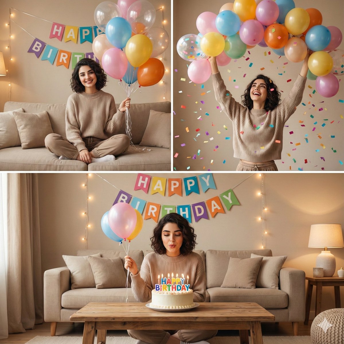 A cozy indoor birthday celebration collage featuring the same woman in multiple moments. Warm, soft-lit living room with neutral beige tones. Colorful “HAPPY BIRTHDAY” decorative banner hanging on the wall as party décor. In one frame, she sits cross-legged on a couch holding transparent confetti balloons and solid color balloons, smiling warmly. In another frame, she raises a large arch of colorful balloons above her head, celebrating joyfully as confetti falls. In another frame, she sits on the couch blowing out candles on a birthday cake placed on a wooden coffee table in front of her, holding balloons in one hand. Casual cozy outfit, natural expressions, realistic skin tones, warm ambient lighting, festive yet intimate home celebration mood, lifestyle photography style, clean composition, ultra-realistic, 1:1 aspect ratio.