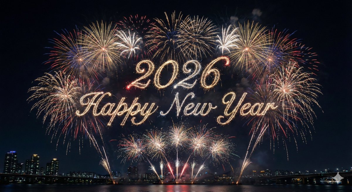 Firework bursts softly illuminate the surrounding sky, producing gentle, cinematic-quality light falloff, capturing a realistic and immersive celebratory atmosphere.