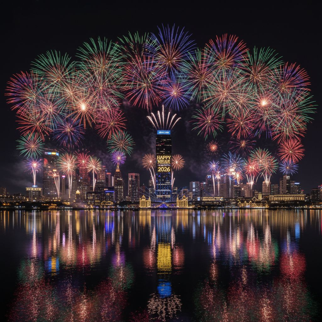 City skyline at midnight, fireworks exploding for New Year 2026, reflections on water, cinematic, vibrant colors, 8K