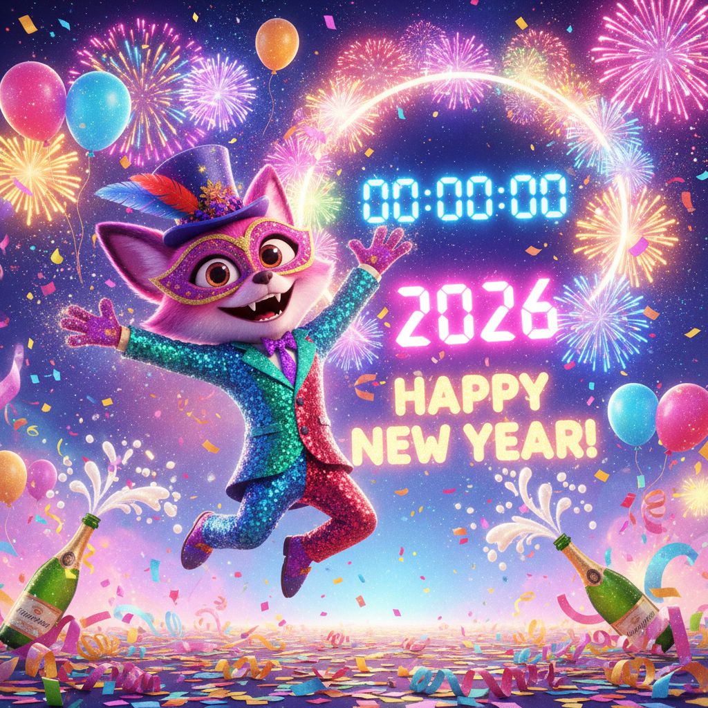 Stylized character celebrating New Year 2026, countdown clock, festive outfit, vibrant colors, cartoonish style, 8K