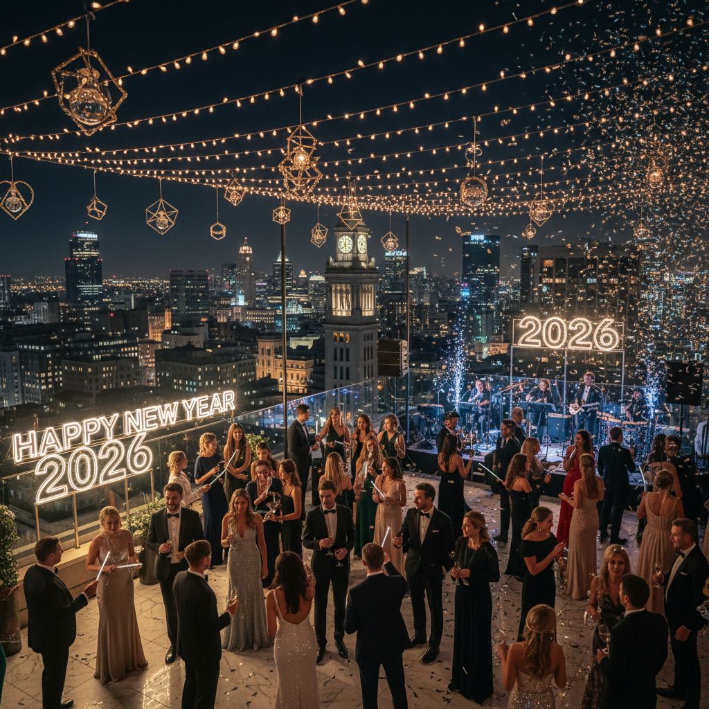 Luxury rooftop New Year 2026 party at night, city skyline, elegant guests, festive lights, cinematic, 8K