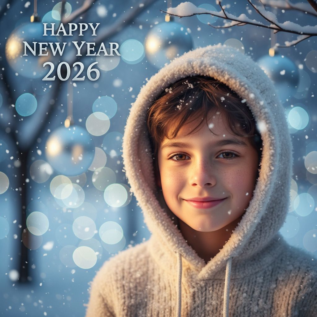 Stylish winter-themed New Year 2026 portrait of a boy wearing a hoodie, soft snowfall, cool blue tones, warm light on face, cinematic bokeh background, calm festive mood, ultra-realistic skin texture, 8K quality.