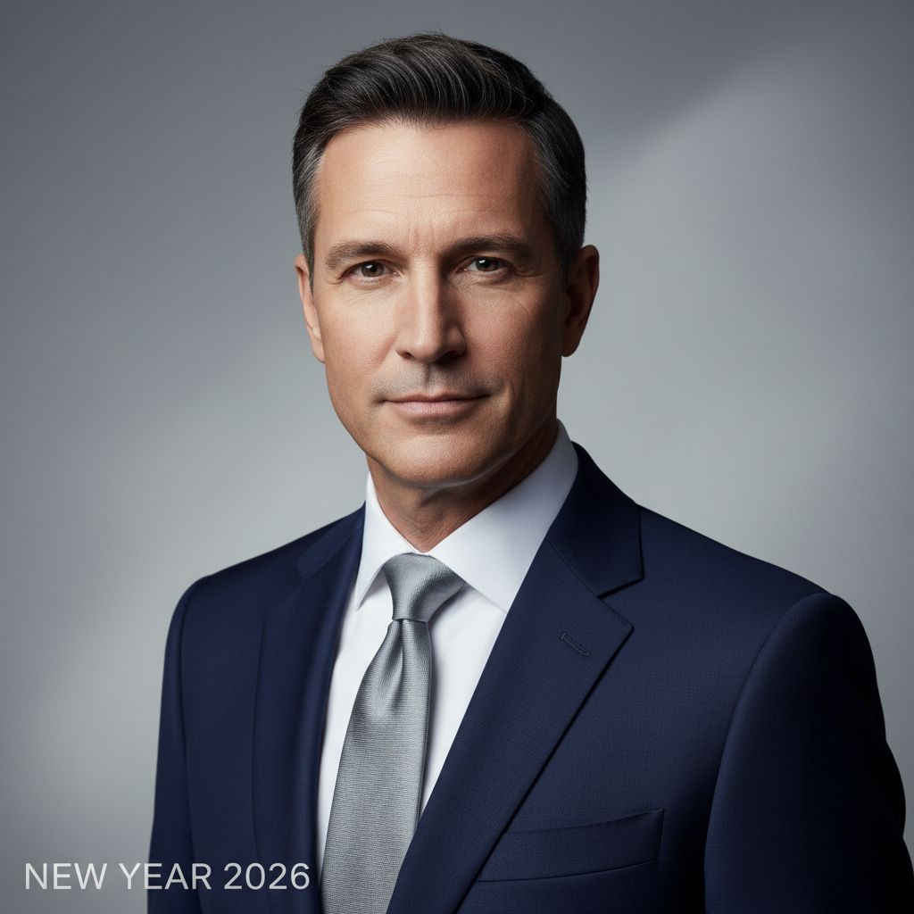 Clean studio-style New Year 2026 portrait of a man with minimal gray background, soft diffused lighting, natural confident expression, professional editorial look, ultra-realistic 8K quality. Keep face unchanged.
